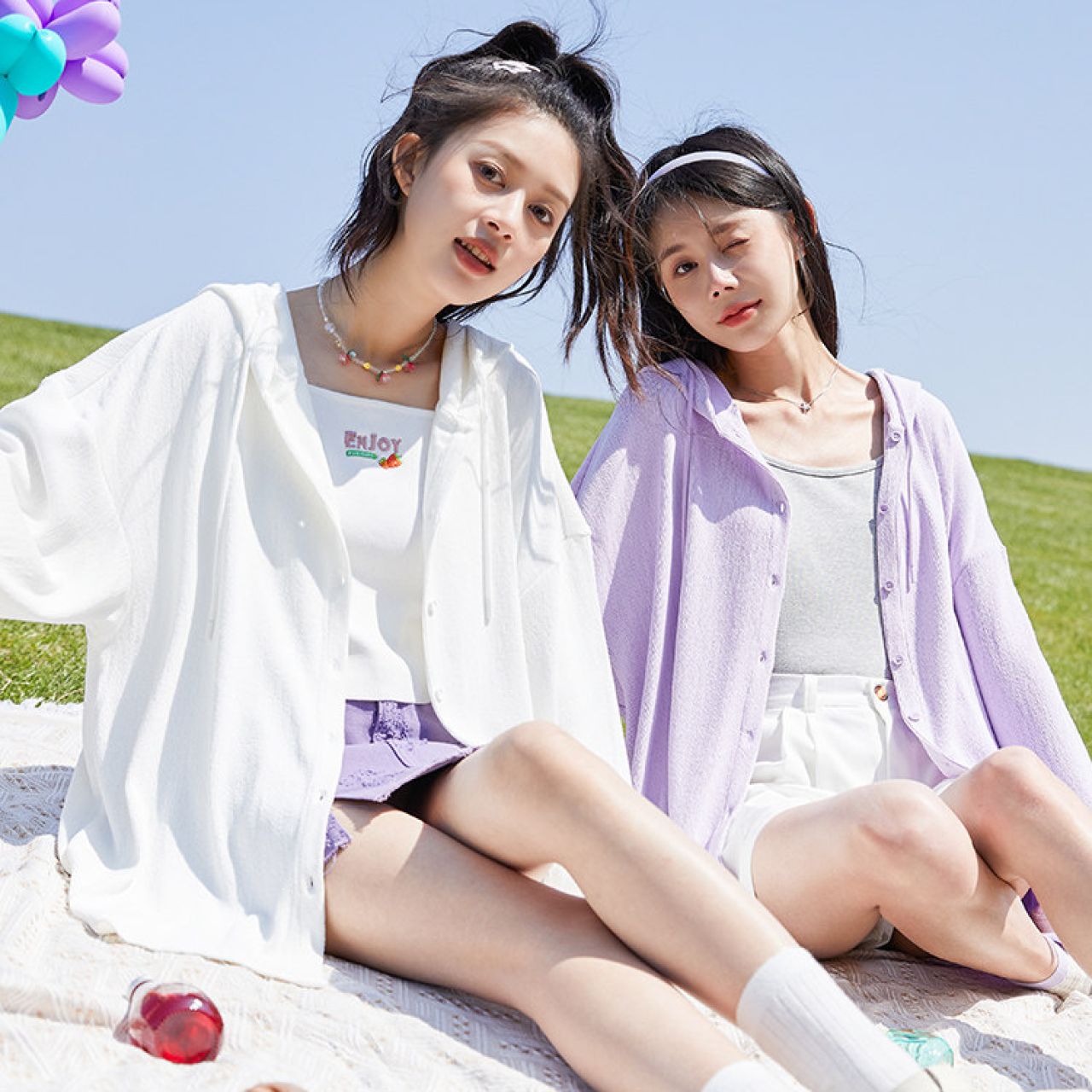 唐狮夏季女款新款空调衫开衫白色长袖连帽罩衫透气薄外套潮
