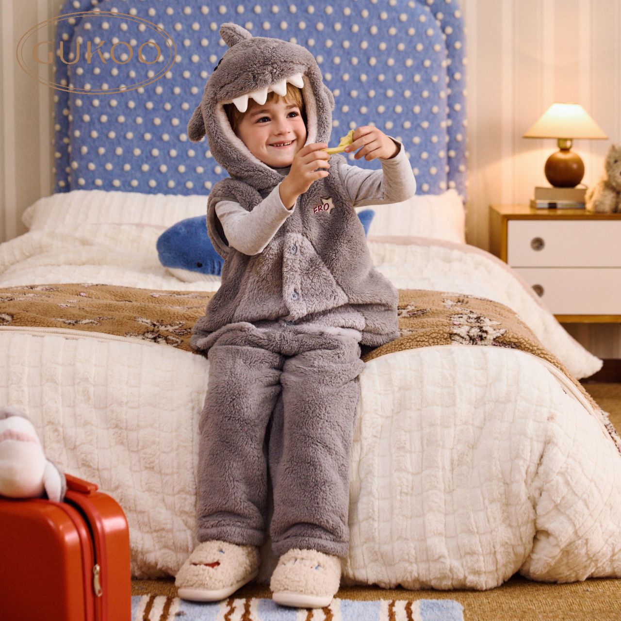 首页> 睡衣> 儿童款> Gukoo/果壳儿童睡衣冬季毛绒保暖新款可爱小鲨鱼男童家居服套装