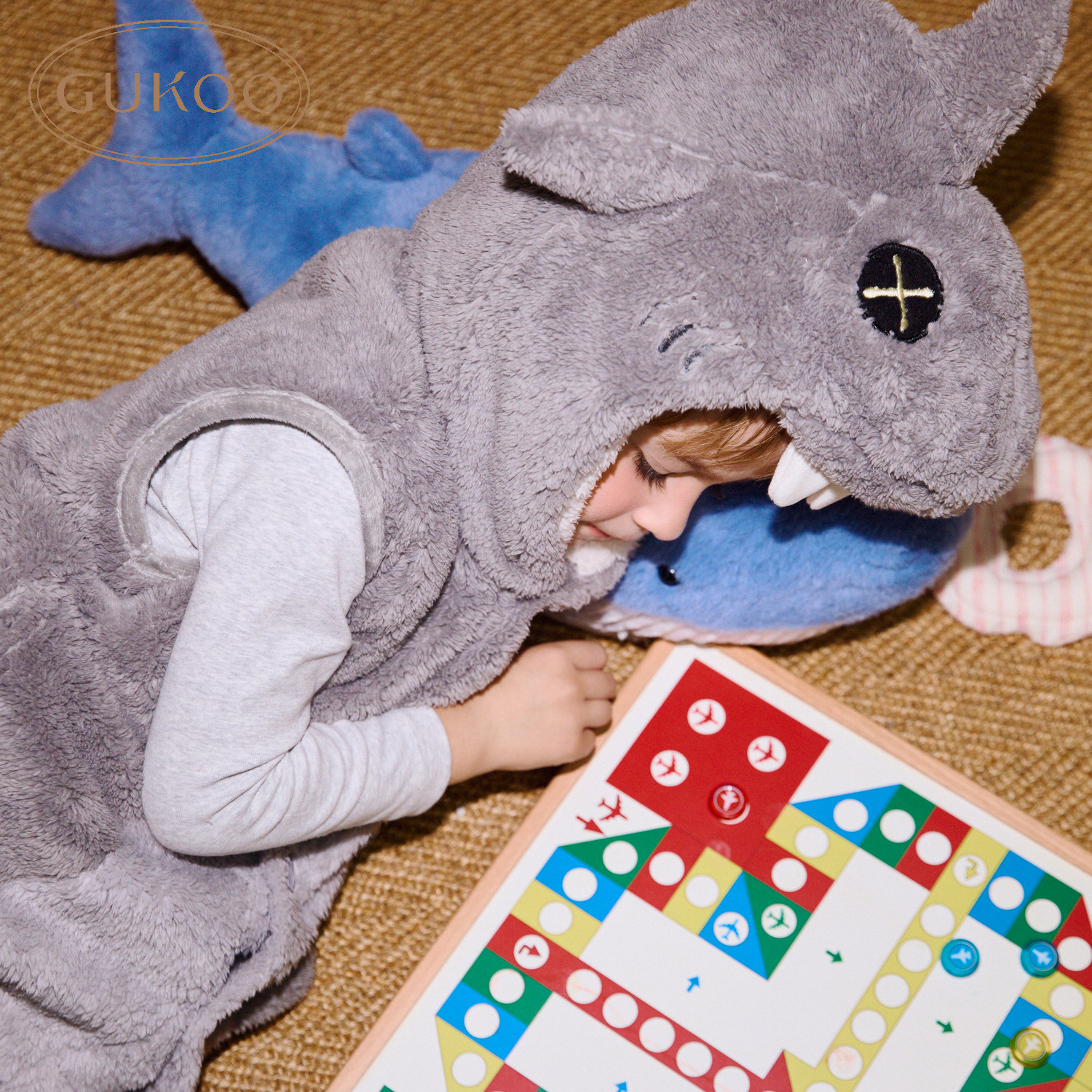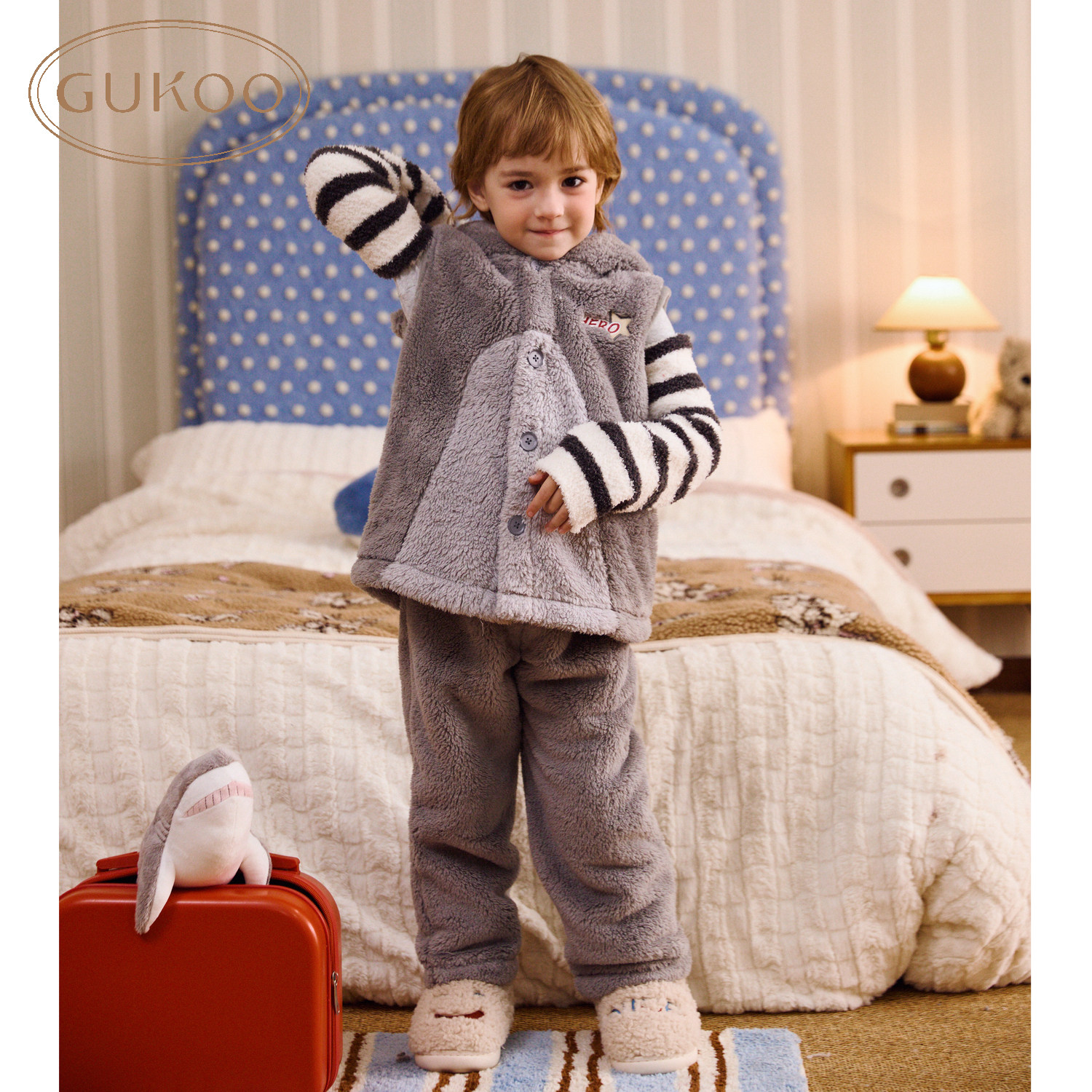 首页> 睡衣> 儿童款> Gukoo/果壳儿童睡衣冬季毛绒保暖新款可爱小鲨鱼男童家居服套装