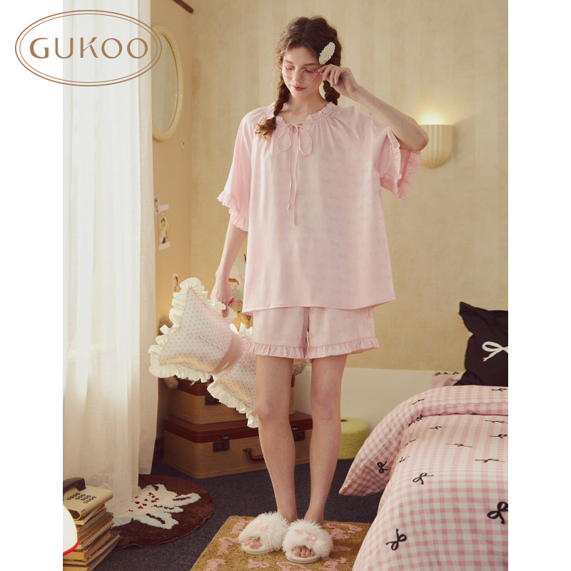 - Gukoo/果壳睡衣女红色格子米奇米妮新款简约女士家居服套装