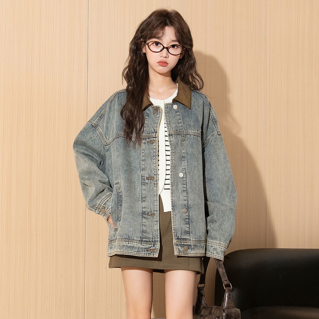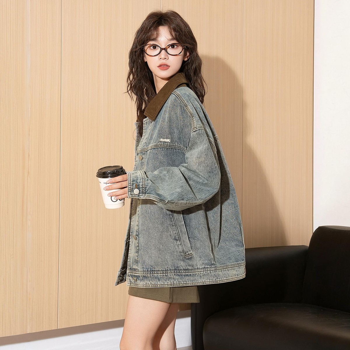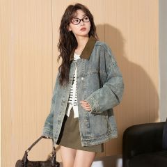 首页> 外套> 牛仔外套> 唐狮26春秋季新款牛仔外套女巴恩风复古做旧潮牌宽松撞色翻领夹克